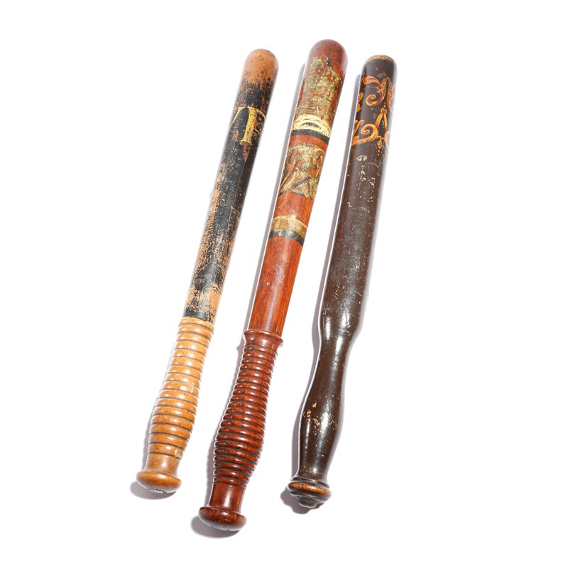 A William IV ebonised wood policeman's truncheon, decorated in gilt with initials 'WR IIII', together with two Victorian truncheons, one stamped 'PARKER HOLBORN 223', the other Scottish stamped 'McNAUGHTON GLASGOW', 46cm long (max). (3)