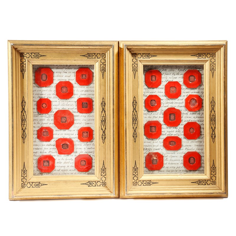 A pair of red wax seal pictures, each with eleven seals mounted on a handwritten letter backing, the seals imprinted with various initials and coats of arms, 12.7 x 22.7cm, in a glazed giltwood box frame. (2)