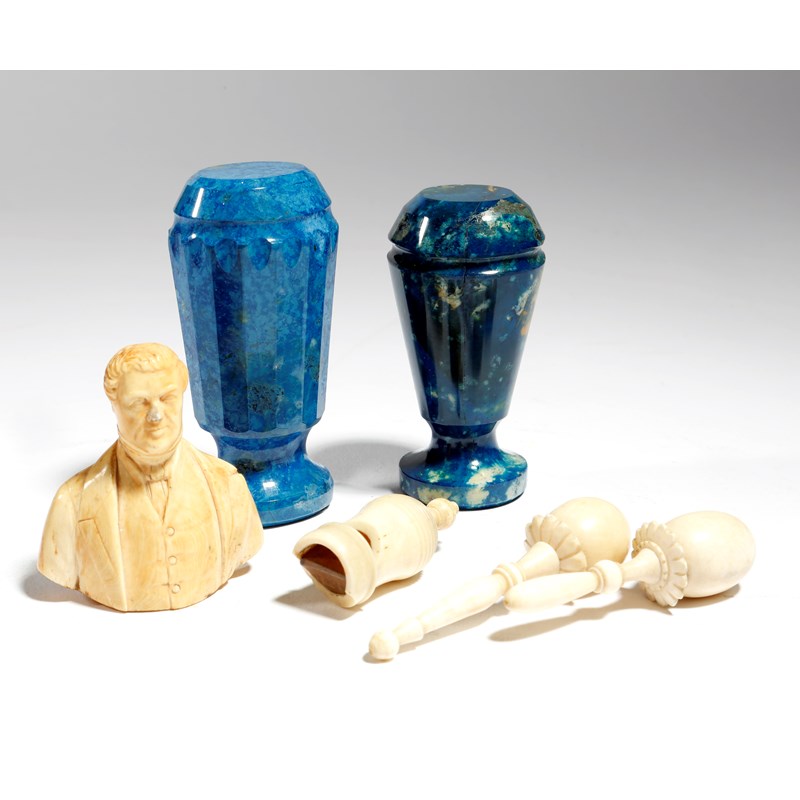 λ A 19th century carved ivory bust of a gentleman, possibly the Duke of Wellington, together with two similar ivory sanders, an ivory whistle and two lapis lazuli desk seals, 7.8cm (max). (5)