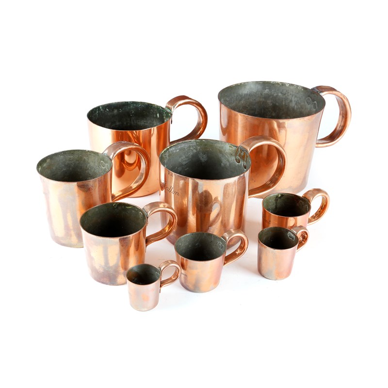 A harlequin set of nine copper navy rum or grog measures, with loop handles, comprising: gallon, two half gallons, quart, pint, half pint, one and a half gill, gill and half gill, with inscriptions and 'GR' crown marks, 17cm high (max). (9)