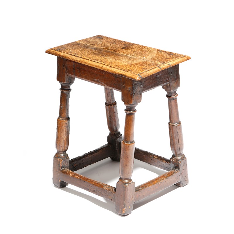 A 17th century oak joint stool, the later seat on turned legs united by peripheral stretchers, 52.4cm high, 46.3cm wide, 33.8cm deep.