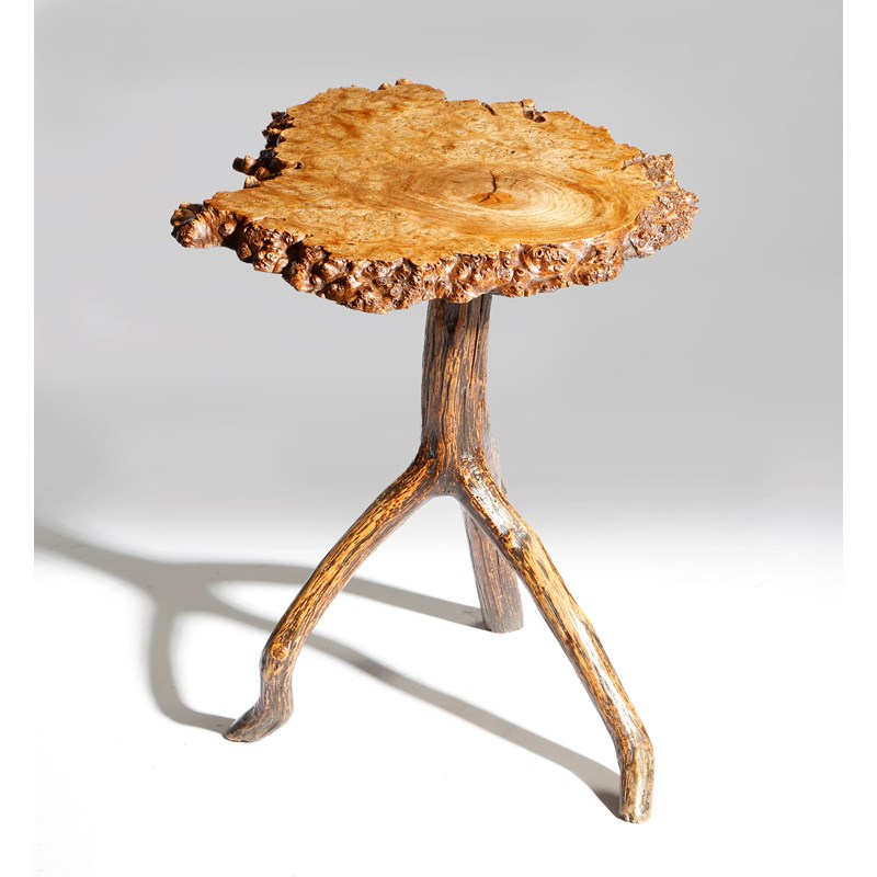 A primitive burr wood table, the rustic ash top on a tripod branch base, probably 19th century, 48.3cm high, 44cm wide.
