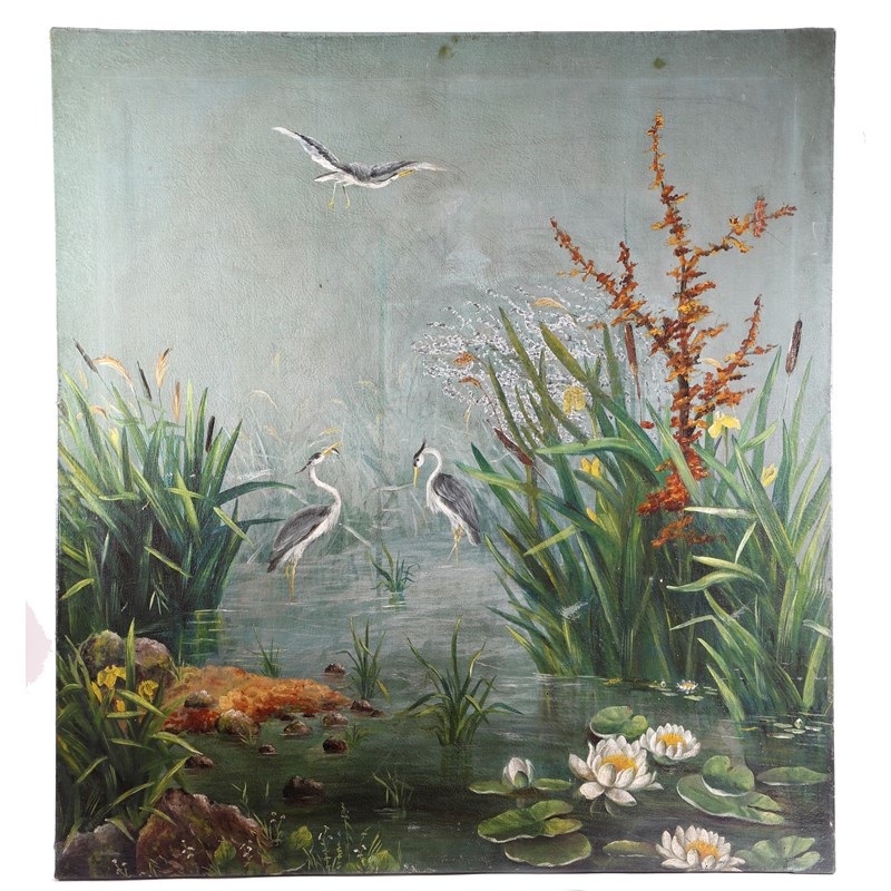Circle of Henry Stacy Marks RA (1829-1898). A painting of a lake view, with three herons fishing, with bulrushes and water lilies, oil on canvas, 90 x 83cm, unframed.