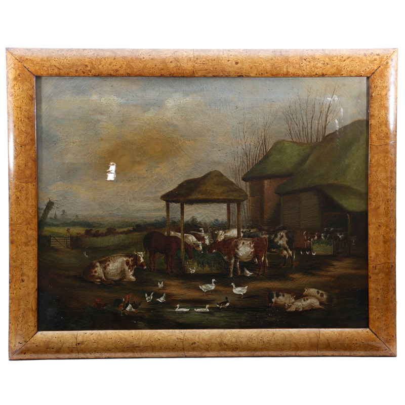 English School (19th century). A naive painting of a farmyard scene, with cows, pigs, ducks and chickens, with a farmer at a gate, oil on canvas, 68.8 x 90cm, in a later burr elm frame.