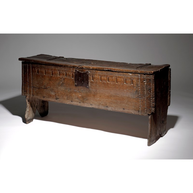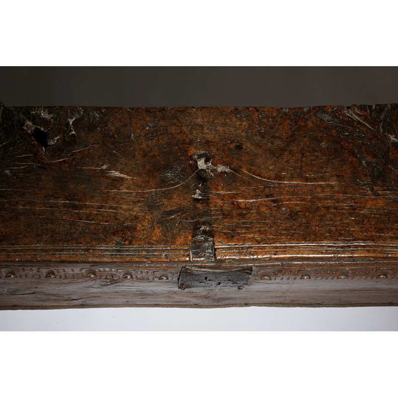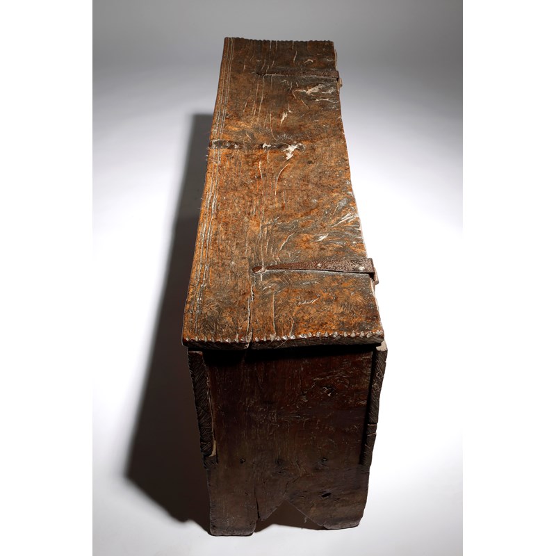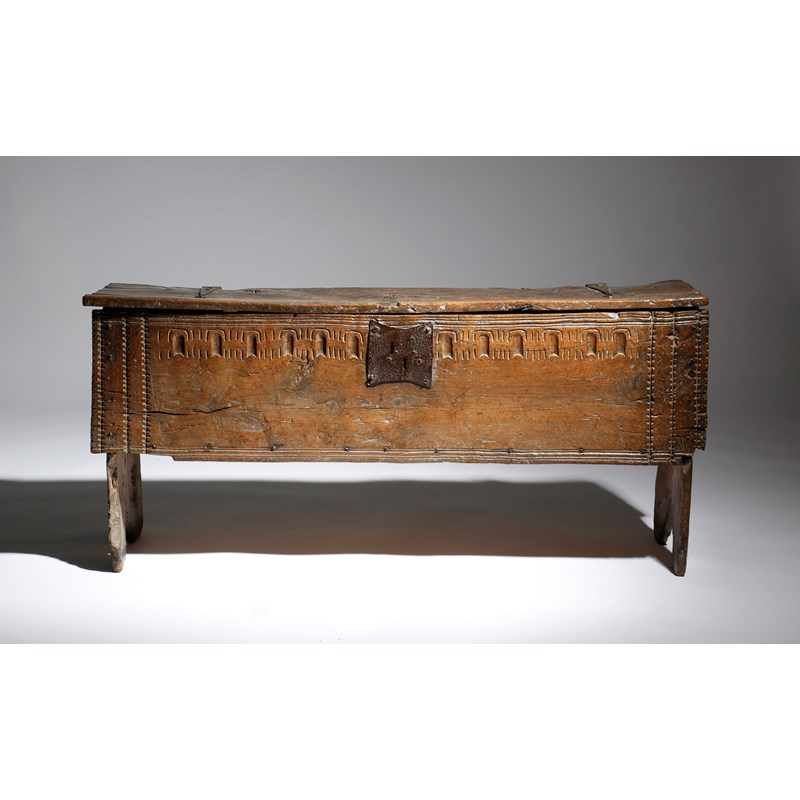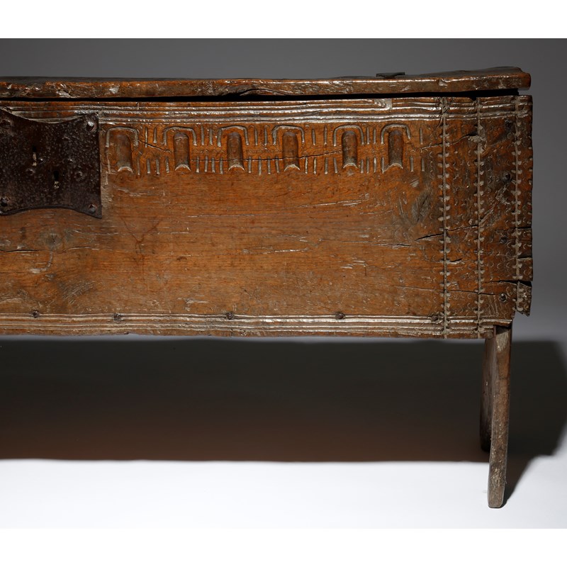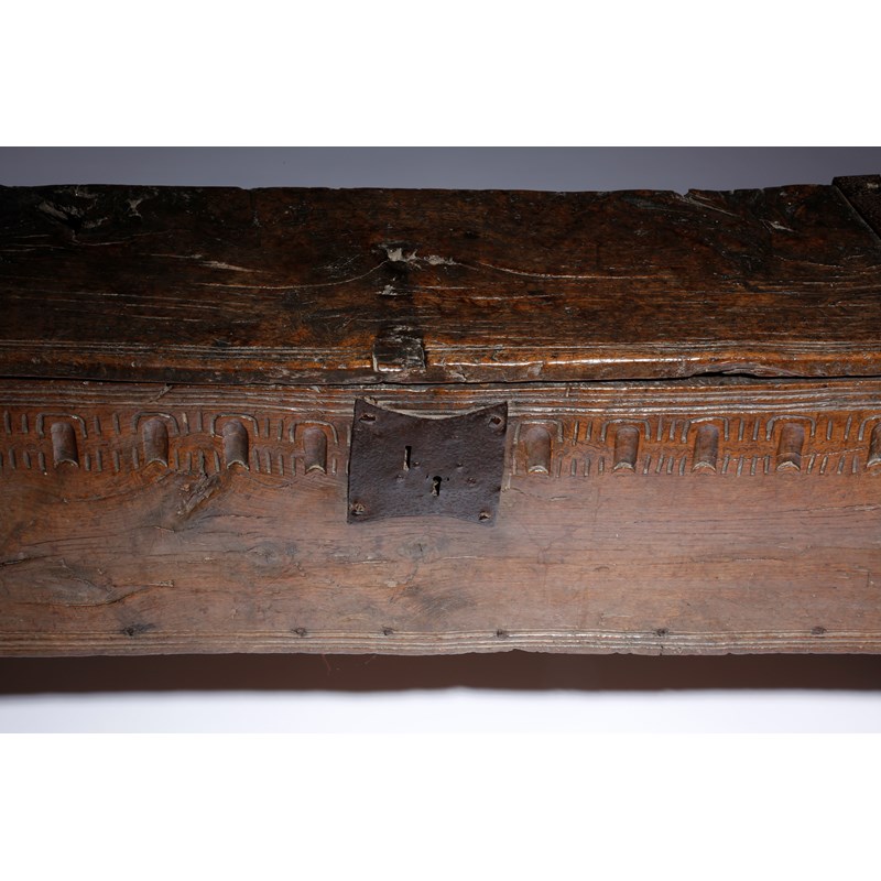An Elizabeth I oak boarded coffer, the top with iron hinges, a moulded edge and crimped ends, revealing a vacant interior, the front with a thumbnail frieze and crimped bands, on cut-out ends, late 16th century, 57.2cm high, 126.7cm wide, 31.2cm deep.
