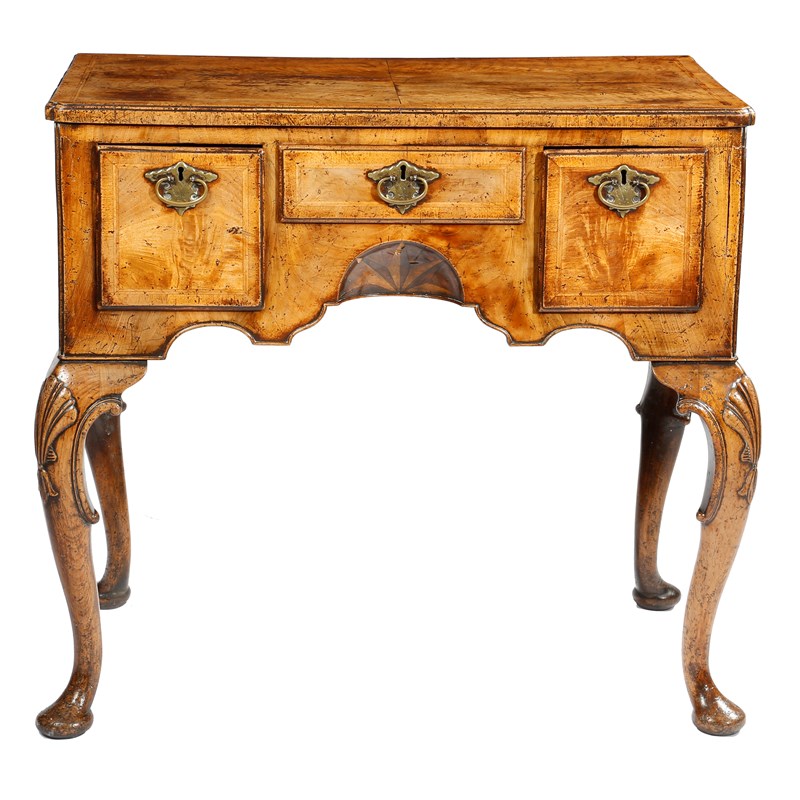 A walnut lowboy in George II style, the quarter veneered top with cross and feather banding, above three conforming frieze drawers and a shaped apron with a concave parquetry sunburst, on shell capped cabriole legs and pad feet, 72.7cm high, 81cm wide, 48.3cm deep.