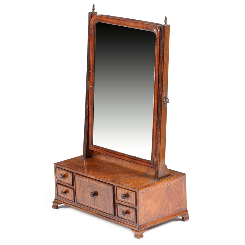 A George II walnut dressing table mirror, the arched plate within a moulded frame, with brass acorn finials, the box base inlaid with stringing and fitted with an arrangement of five drawers, 65.3cm high, 42cm wide, 22cm deep.