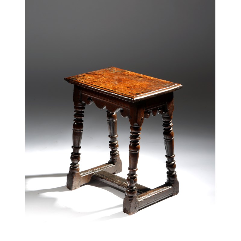 A rare Charles I oak joint stool, the seat with a moulded edge, above a moulded frieze with bicuspid rails and elaborately turned legs united by a flat 'H' stretcher, probably West Country, 54.1cm high, 44.2cm wide, 32cm deep.