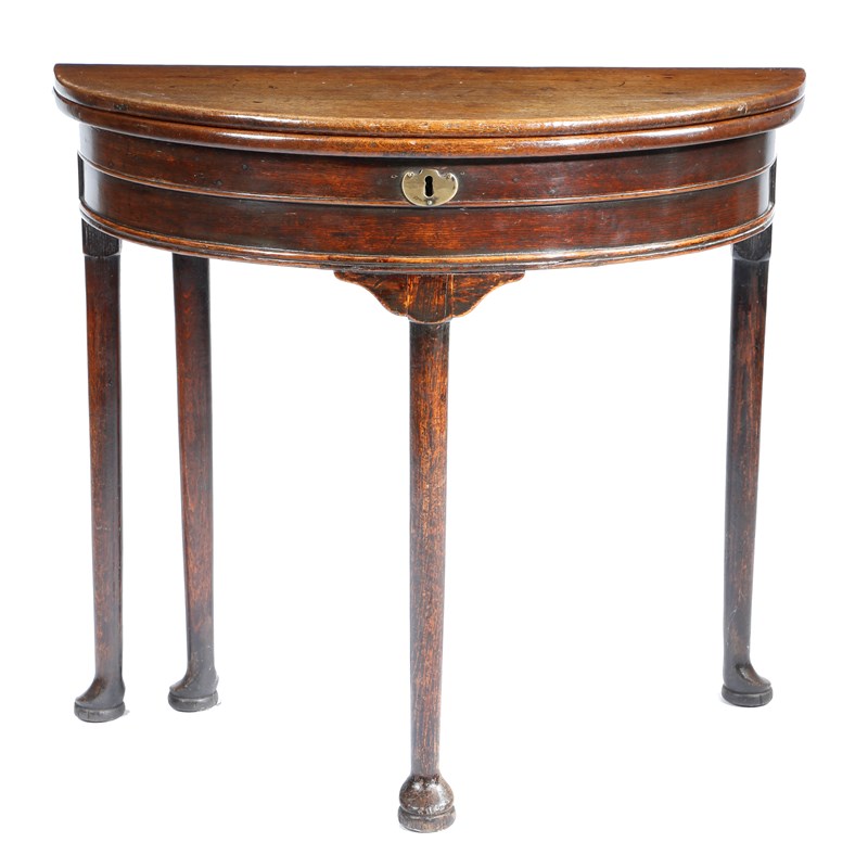 A George II oak demi-lune tea table, the twin hinged top on a single gate support revealing a vacant interior, on turned club legs and pad feet, 72cm high, 81.4cm high, 39.6cm deep.