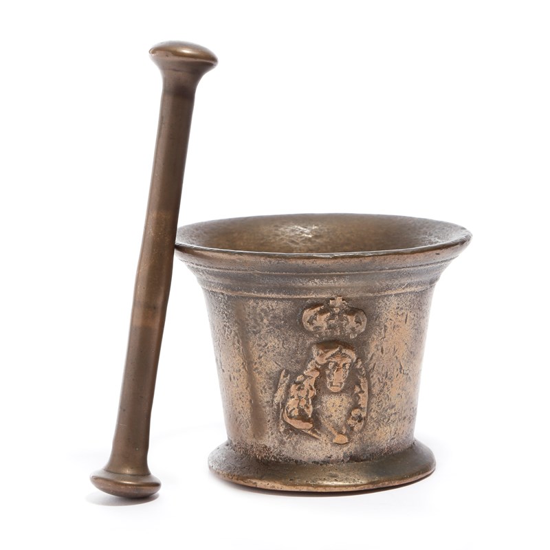 A Charles II bronze mortar, the body cast with two portraits of King Charles, with an associated pestle, 10cm high, 12.5cm diameter (2).