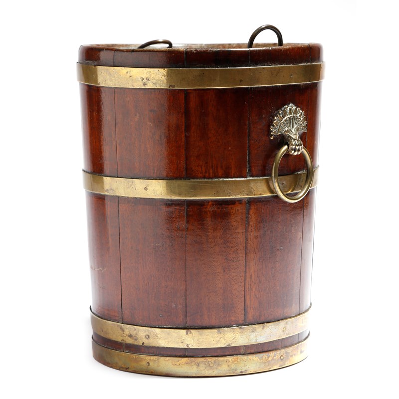 A Regency mahogany and brass bound wine bottle holder / cooler, of staved construction, with a lift-out metal liner and clenched fist ring handles, 22.5cm high.