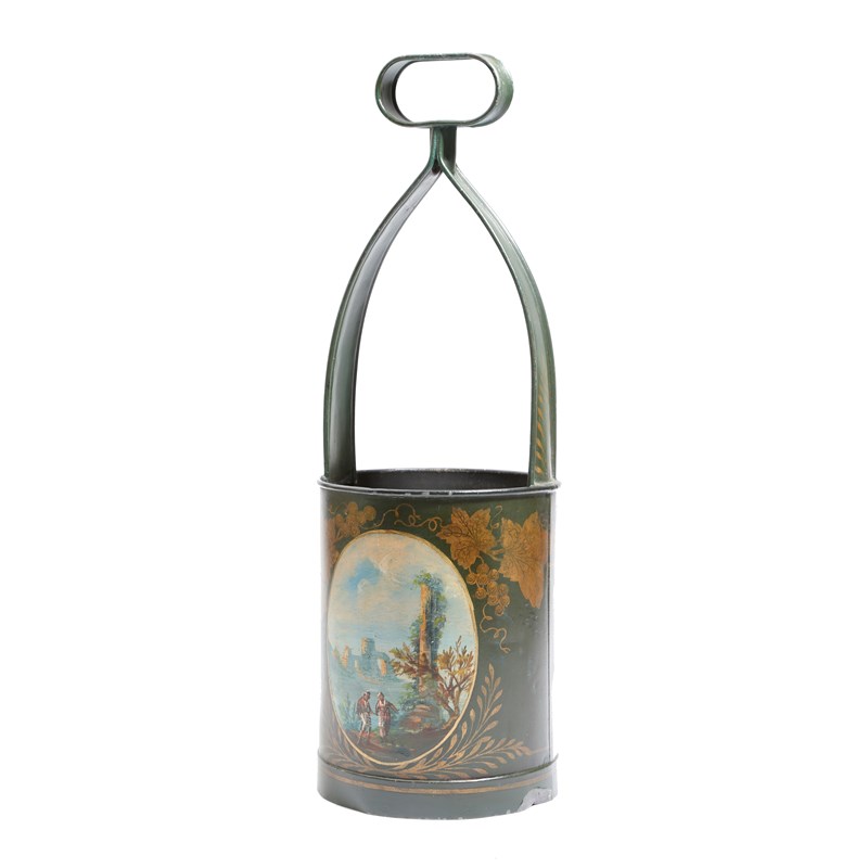 A tôle peinte wine bottle carrier in Regency style, the body with an oval panel painted with an Italianate scene and decorated in gilt with vine leaves and grapes, 49cm high.