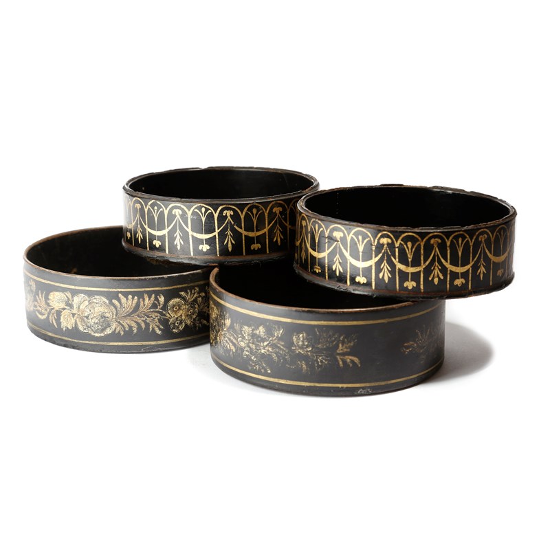 Two pairs of Regency papier-mâché wine coasters, one decorated with flowers, the other in gilt with swags, 13.5cm diameter (max). (4)