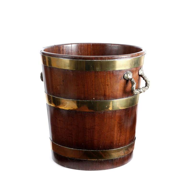 A George III mahogany and brass bound peat bucket, of staved construction, with a pair of grapevine and ribbon cast handles, 44cm high, 49cm wide.
