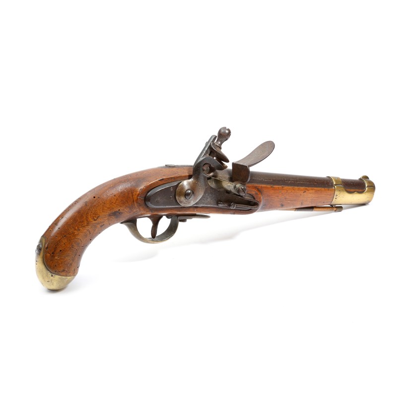 A continental military walnut and brass mounted flintlock pistol, stamped with various numbers, late 18th / early 19th century, 43.5cm long.
