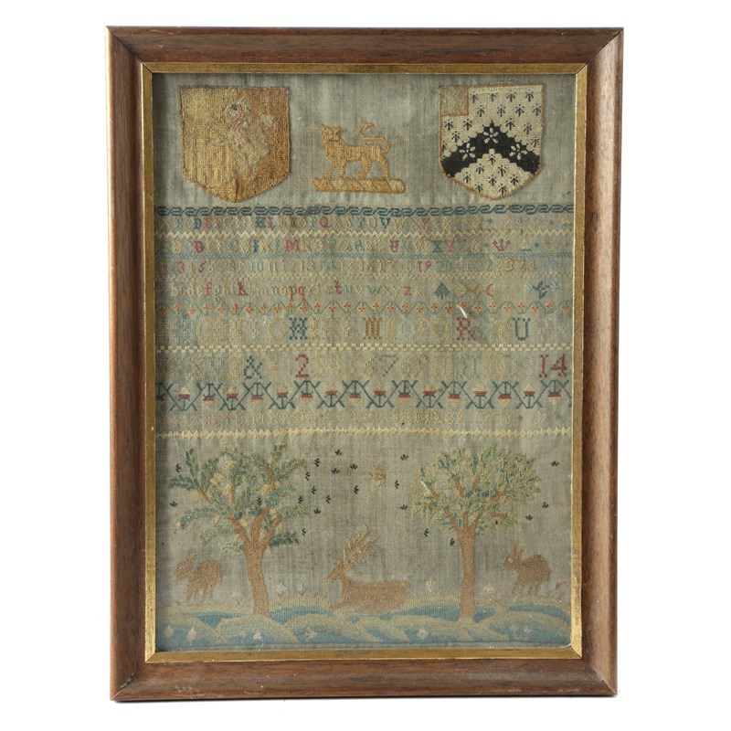 worked in colours with a lion passant guardant flanked by two armorial shields above lines of alphabets and numerals, a stag and two other deers on hillocks between trees, in a later frame and glazed