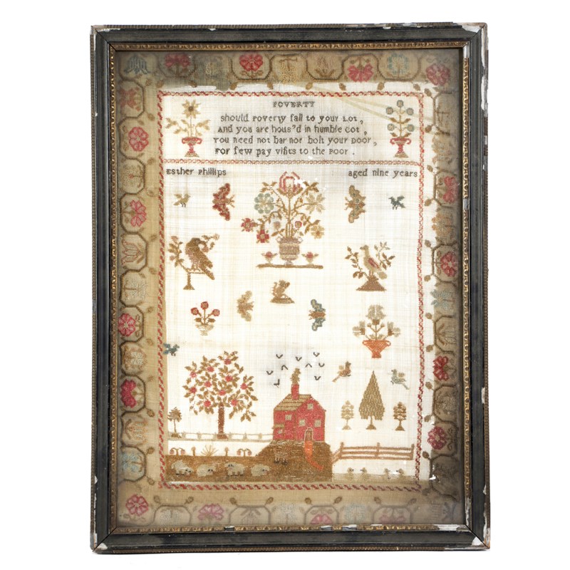 worked in colours with a rhyme titled 'Poverty' above plants, birds, insects and sheep, outside a farmhouse, inscribed 'Esther Phillips aged nine years', inside a meandering flowerhead border, in a Hogarth style frame