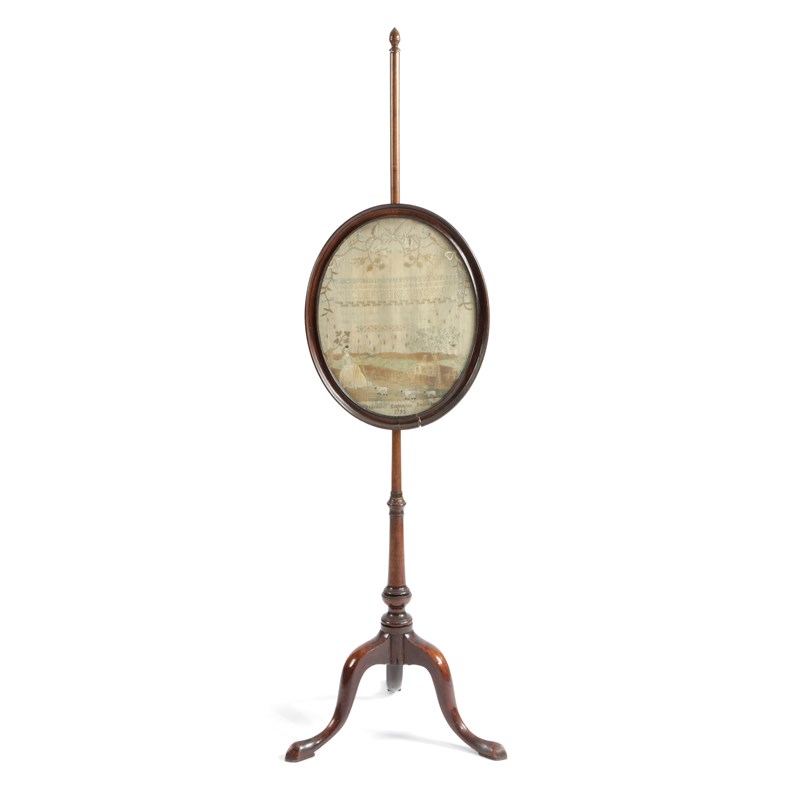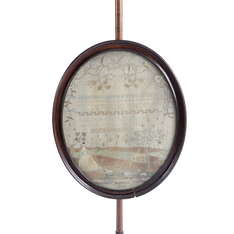 with an adjustable oval panel with a needlework sampler by Susannah Engledow, dated 'December 1793', worked with a shepherdess with her flock in a landscape setting with alphabet, numbers and a short verse