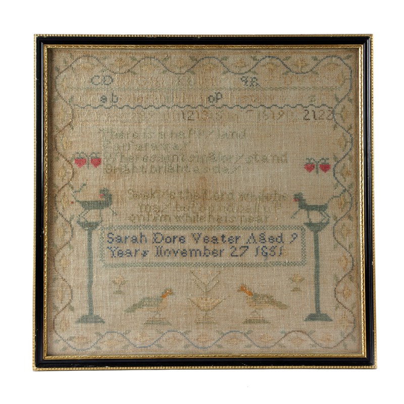 worked with coloured wool on a linen ground, with alphabets, numerals, a rhyme, animals, birds and foliage, inscribed 'Sarah Dore Veater Aged 9 Years November 27 1851', in a later glazed Hogarth style frame