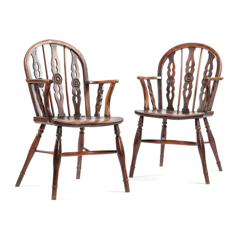 each with a rondel decorated triple pierced splat back, above an elm saddle seat, on turned legs united by a crinoline stretcher (2)