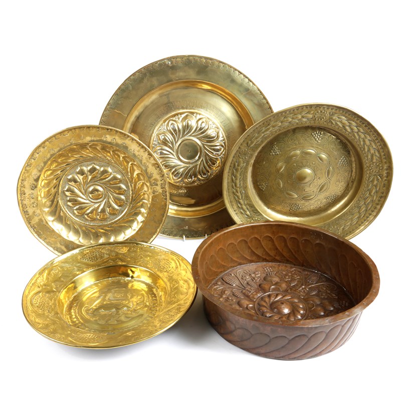 the centre with a repoussé whorl boss inside a Gothic script border, the rim with punched fleur-de-lys decoration, three further brass alms dishes and a German 15th century style copper basin (5)