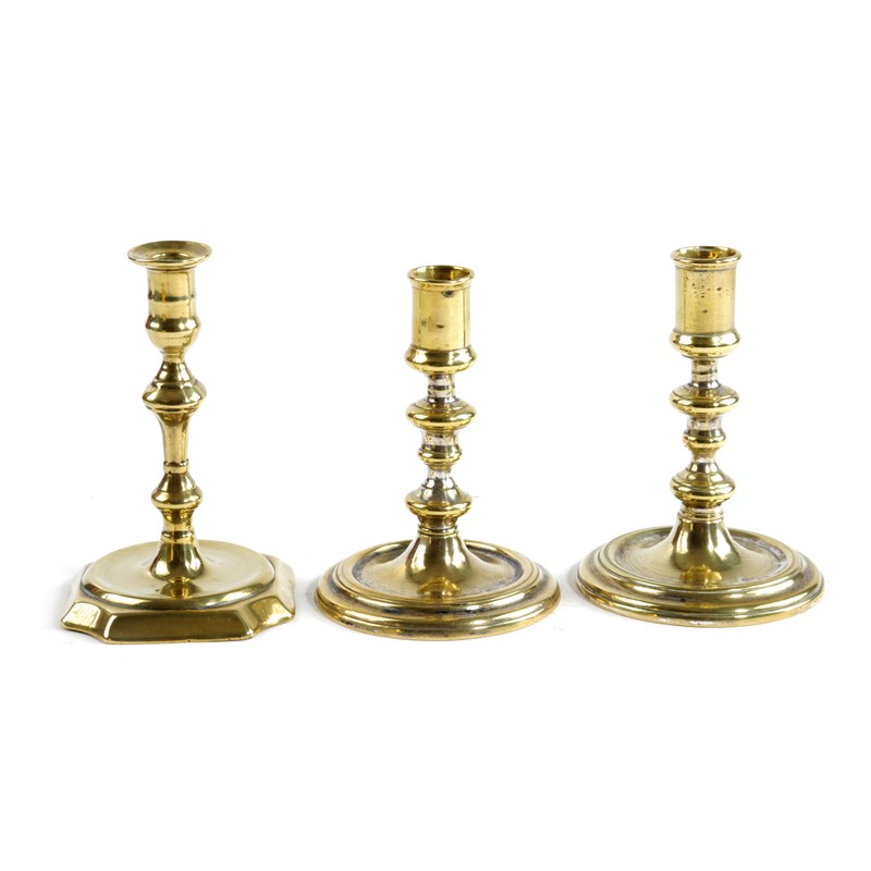 each with a cylindrical socket above a knopped stem and banded, spreading foot, with traces of silvering, together with another, c.1730, with a square inverted baluster stem and cut corner foot (3)