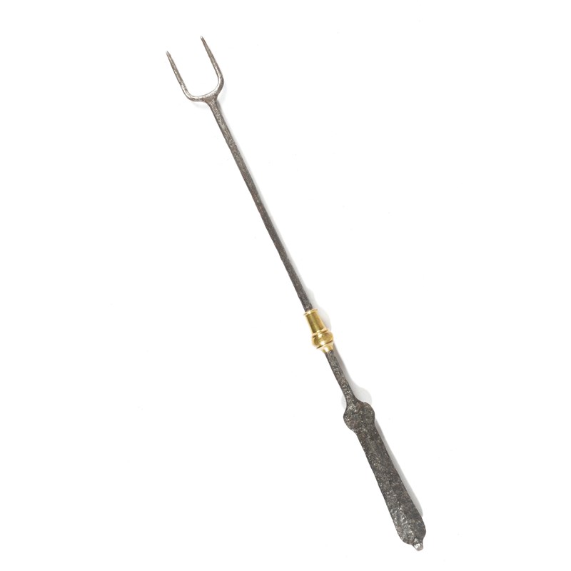 with two tines, a brass baluster knop, flattened handle and suspension hook