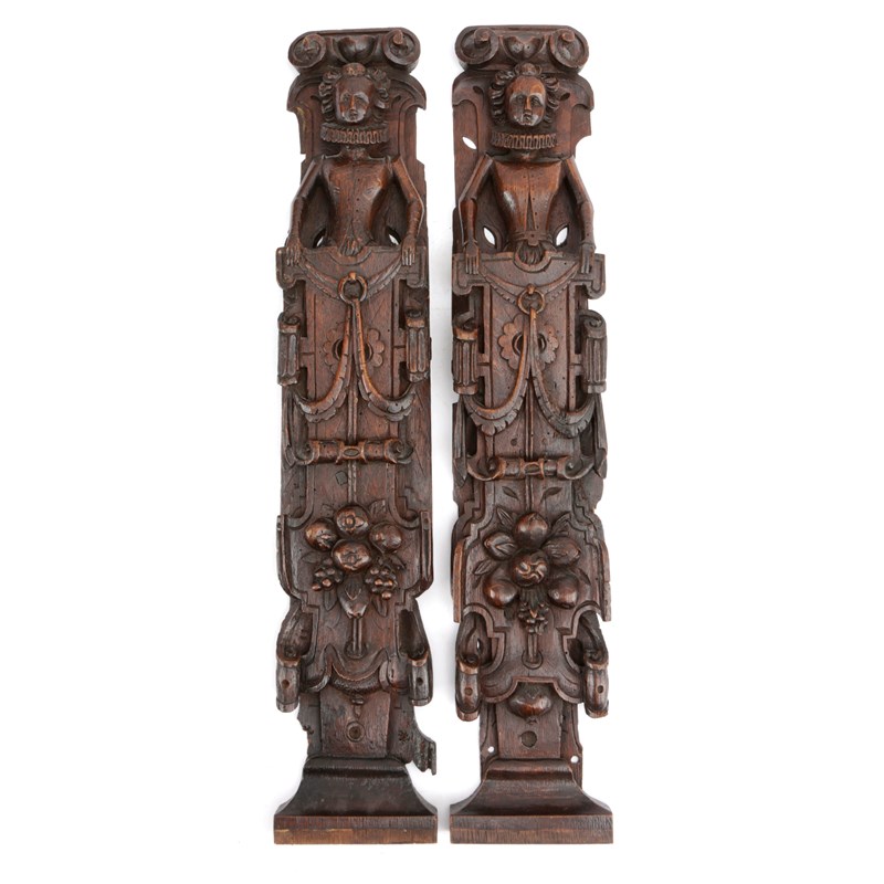 A PAIR OF ELIZABETH I OAK FIGURAL TERMS