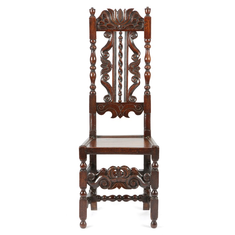 the top rail carved with a central tulip above a splat with a central barley twist flanked by scrolls and further tulips, a solid seat, a scrolling rail, baluster turned stretcher and block and turned front legs