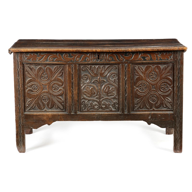 the underside of the lid with Gothic strapwork printed wallpaper and with an open till, the triple panelled front carved with leaves and with the date and initials 'EW1674'