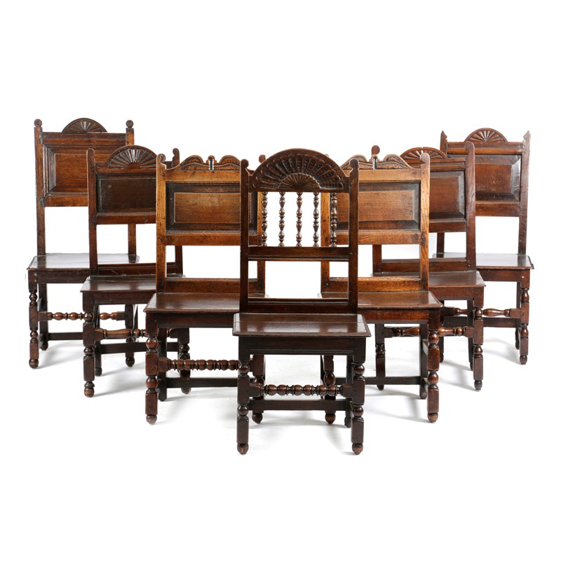 each with a 'letterbox' back, five with a fan top rail, one with a spindle back and a pair with a scroll surmount (7)