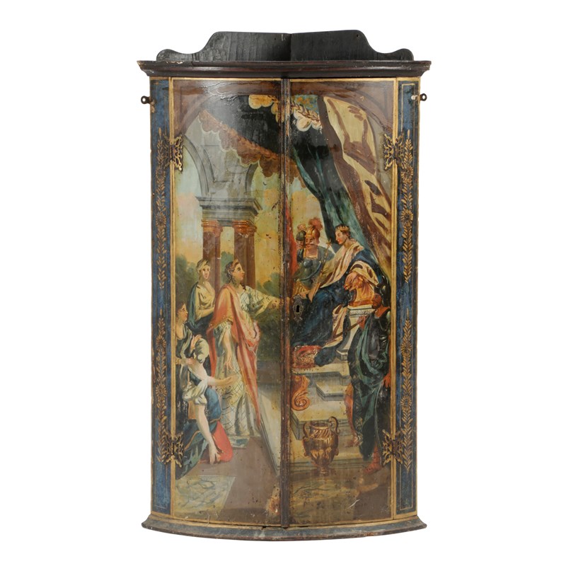 A DUTCH PAINTED BOWFRONT HANGING CORNER CUPBOARD