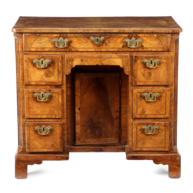 with feather and crossbanding, the quarter veneered top with a caddy moulded edge above an arrangement of eight walnut lined drawers around a cupboard flanked by fluted angles