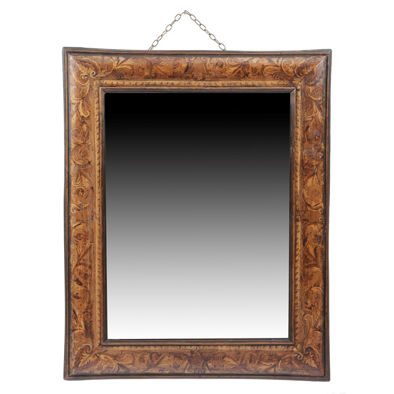 A WILLIAM AND MARY WALNUT AND MARQUETRY CUSHION MIRROR