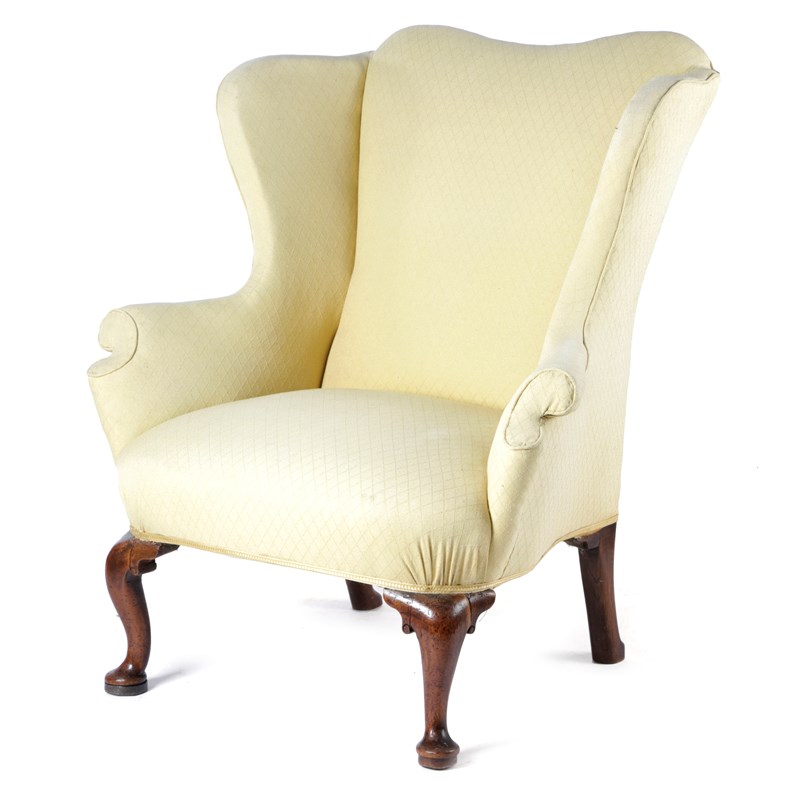 later upholstered with lattice fabric, with scroll arms on cabriole front legs and pad feet