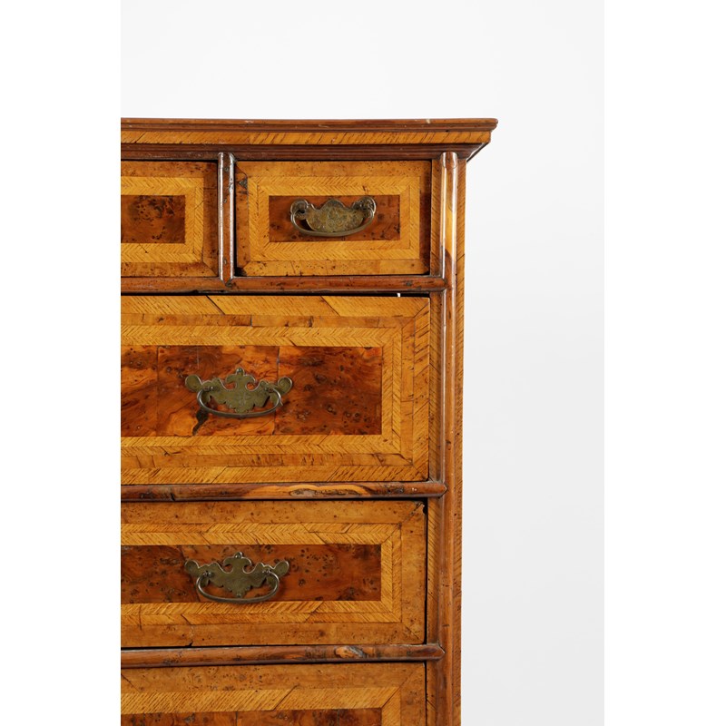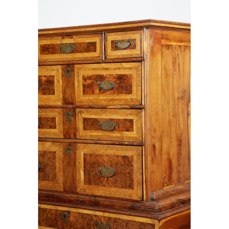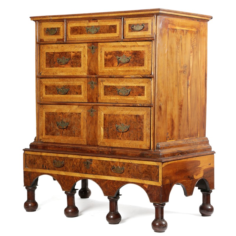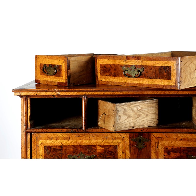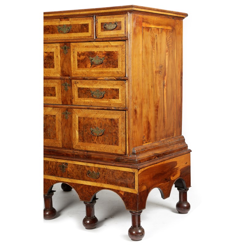 with ash banding and burr yew panels, fitted with three short and three long elm lined drawers with secret drawers behind, the stand with a long drawer on later bun feet