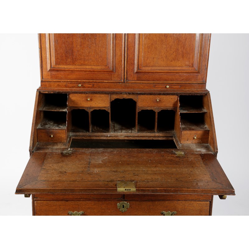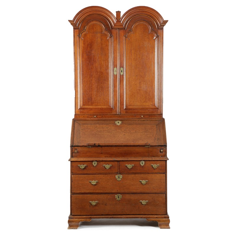 the double domed top above a pair of panelled doors enclosing adjustable shelves and pigeonholes, with a pair of candleslides above the hinged fall enclosing further pigeonholes and drawers and a sliding well cover, above two short and two long drawers