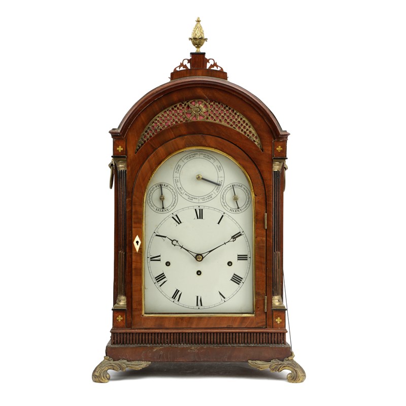 the brass eight day twin fusee movement with dual repeat mechanisms on a nest of twelve bells and striking on a further single bell, the backplate with engraved foliate borders and the bob pendulum with a sunburst, the enamelled dial, probably later, with black Roman hours numerals beneath an arch with a central chime selector dial flanked by 'Strike Silent' and Chime Silent' dials, the domed case with a gilt metal pineapple finial above silk backed gilt metal sound frets, stop fluted quarter columns, ivory escutcheon and brass scrolling feet, with a pendulum