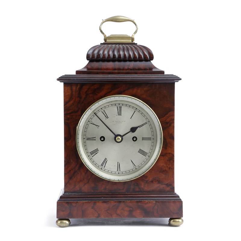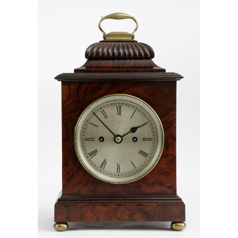 the brass eight day, chain driven twin fusee movement with an anchor escapement and striking to a gong, the backplate stamped '1370', on a silvered dial with black Roman numerals and inscribed 'W.PAYNE & CO. LONDON', the case with a fan reeded caddy top, moulded rims and brass feet