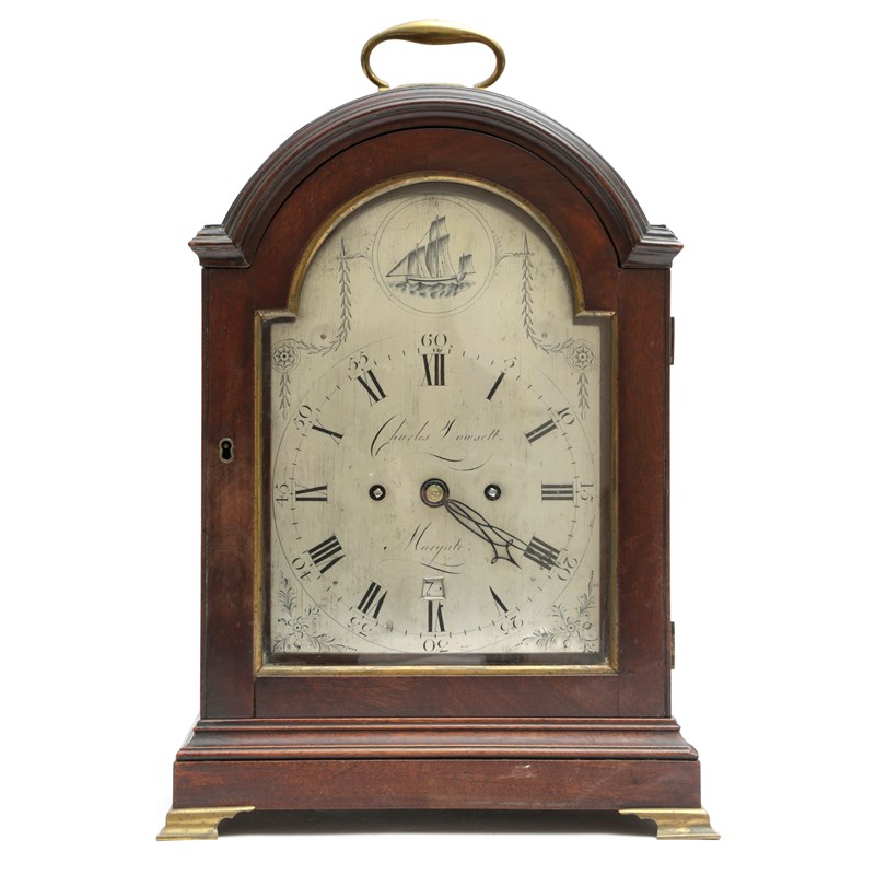 the brass eight day, twin fusee movement with an anchor escapement and striking on a bell (now missing), the backplate engraved with scrolling floral decoration around a central exotic bird, the silvered dial with black Roman hours and Arabic five minutes, the centre inscribed 'Charles Dowsett, Margate' above a date aperture, the arch with a rondel engraved with a sailing boat, with floral spandrels, the arched case with a brass carrying handle, with a pendulum