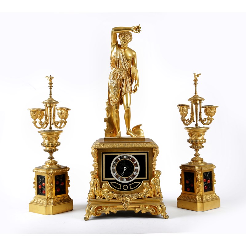 A FRENCH NAPOLEON III ORMOLU AND PIETRA DURA CLOCK GARNITURE