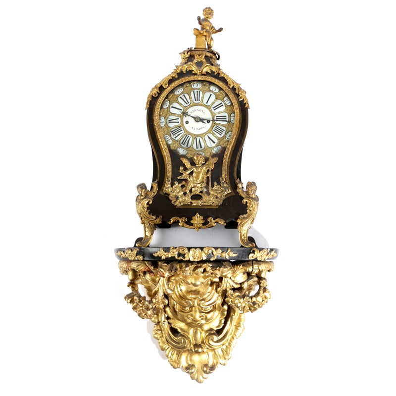 the brass eight day movement with an anchor escapement and striking on a bell, the gilt dial inset with black enamel Roman and Arabic numerals around a centre inscribed 'SAVARY A Paris', the waisted, tortoiseshell case with gilt metal foliate and figural mounts beneath a putti finial, with a pendulum, together with a Régence giltwood and ebonised bracket, the grotesque mask with floral swags (2)