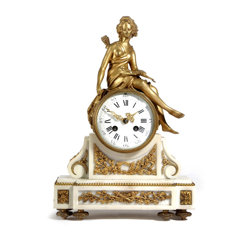 A FRENCH WHITE MARBLE AND GILT BRASS MOUNTED MANTEL CLOCK