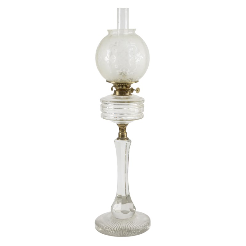 with brass mounts, the etched globe shade above a reservoir and a faceted baluster stem