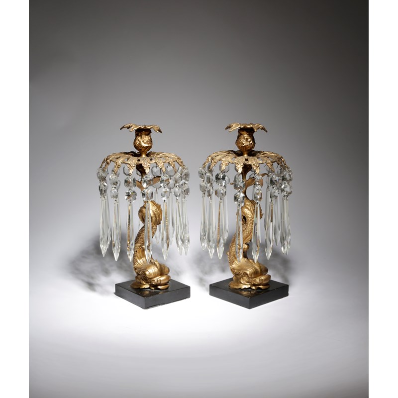 A PAIR OF VICTORIAN ORMOLU AND CUT GLASS LUSTRE CANDLESTICKS