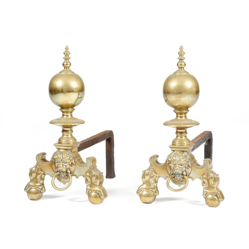 A pair of Dutch brass andirons, with turned ball finials, above lion's masks, on claw and ball feet, with iron supports, 19th century, 46cm high, 26.6cm wide, 39.5cm deep. (2)