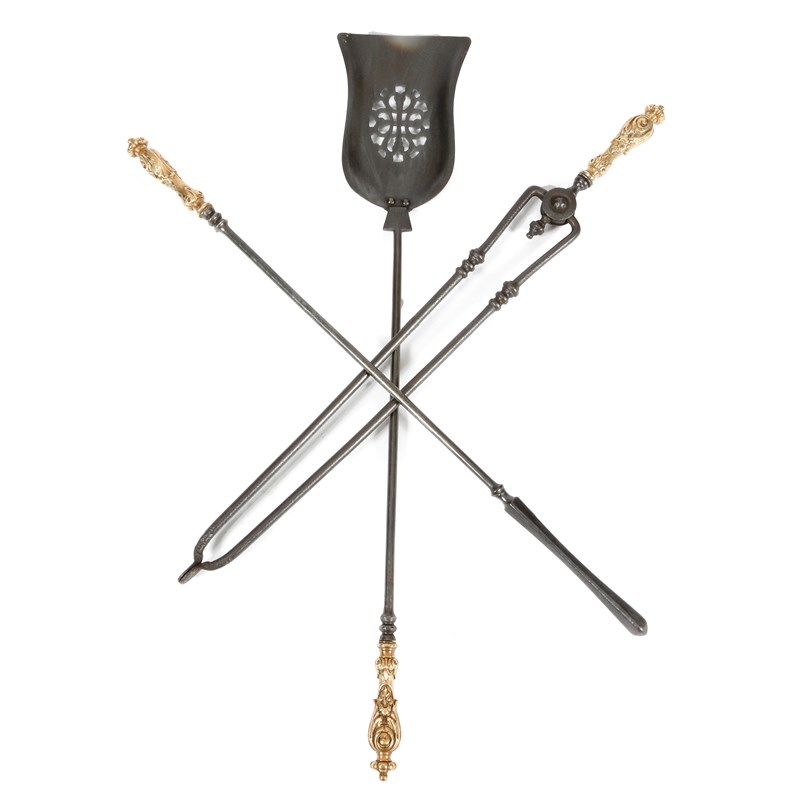 Three steel and bronze fire irons