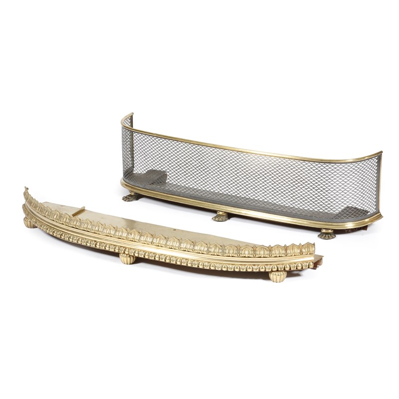 A William IV gilt brass or bronze bowfront fender, with a band of lappet decoration above an ovolo moulding and on ribbed bun feet, 111.5cm wide, together with a brass bowfront fender, with a mesh guard and on paw feet, 101cm wide. (2)