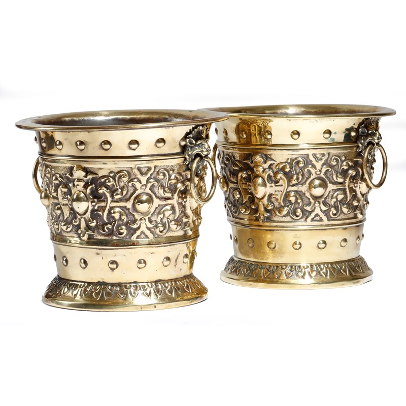 A pair of late 19th century Dutch brass jardinières, each decorated with cartouches, on a strapwork ground and with lion's mask ring handles, 21.6cm high, 25cm diameter. (2)