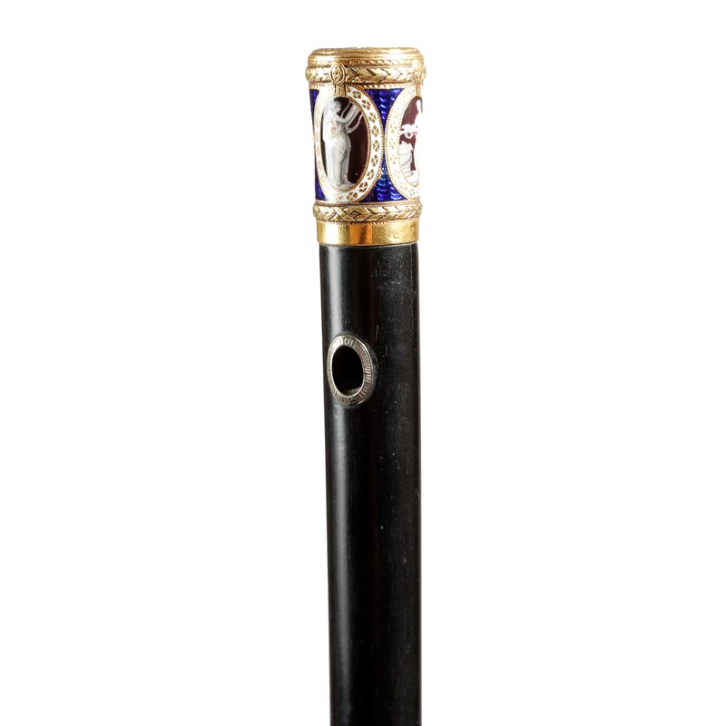 A George III gold and enamel mounted walking cane, the handle with initials' SB' within chased laurel leaf borders, interspersed with oval paterae and with five oval panels decorated en grisaille with the muses, with an indistinct and worn maker's mark, with an ebony tapering shaft, 96cm long.